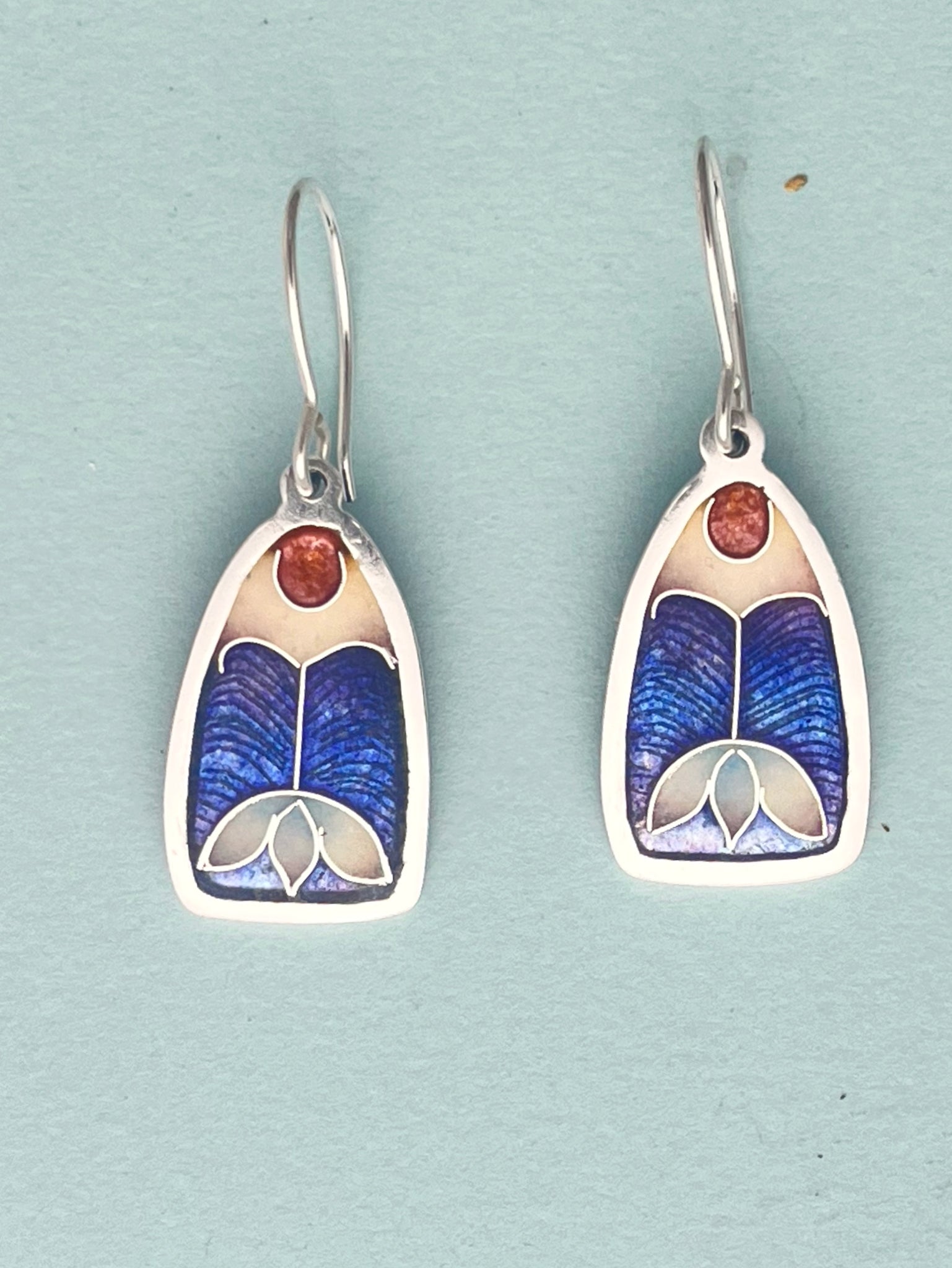 These deco style tulip earrings showcase a simple cloisonné design. Pearly white petals against a blue and violet background with a rich red accent on fine silver. These earrings hang from 940 argentium silver ear wires about 1.5" from the ear. The earring itself measures 1" by 1/2".
