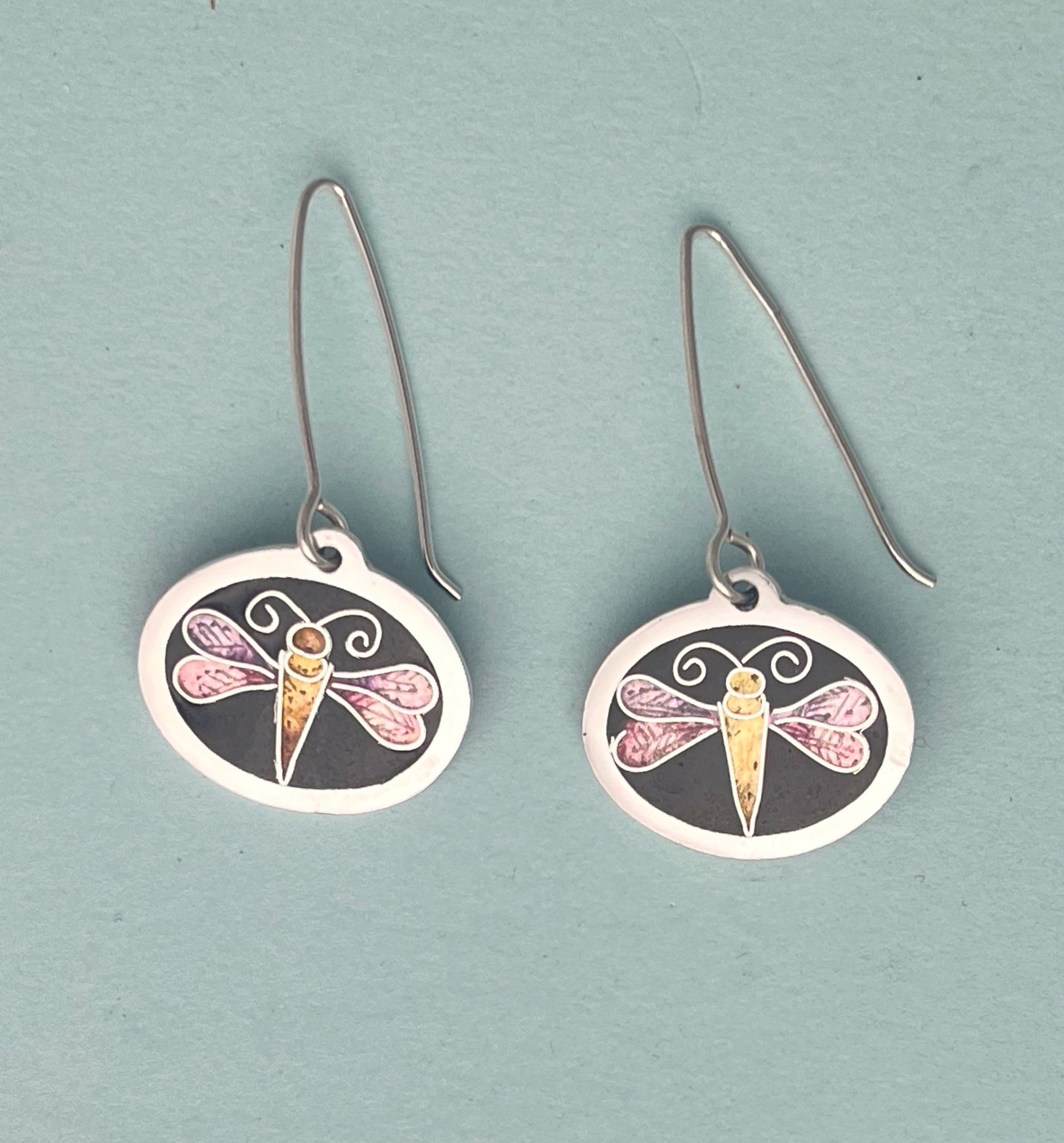 Delicate cloisonné enamel earrings with a purple dragonfly against a black background. These earrings hang 1.5" from the ear on sterling silver ear wires. Vitreous enamel on fine silver.