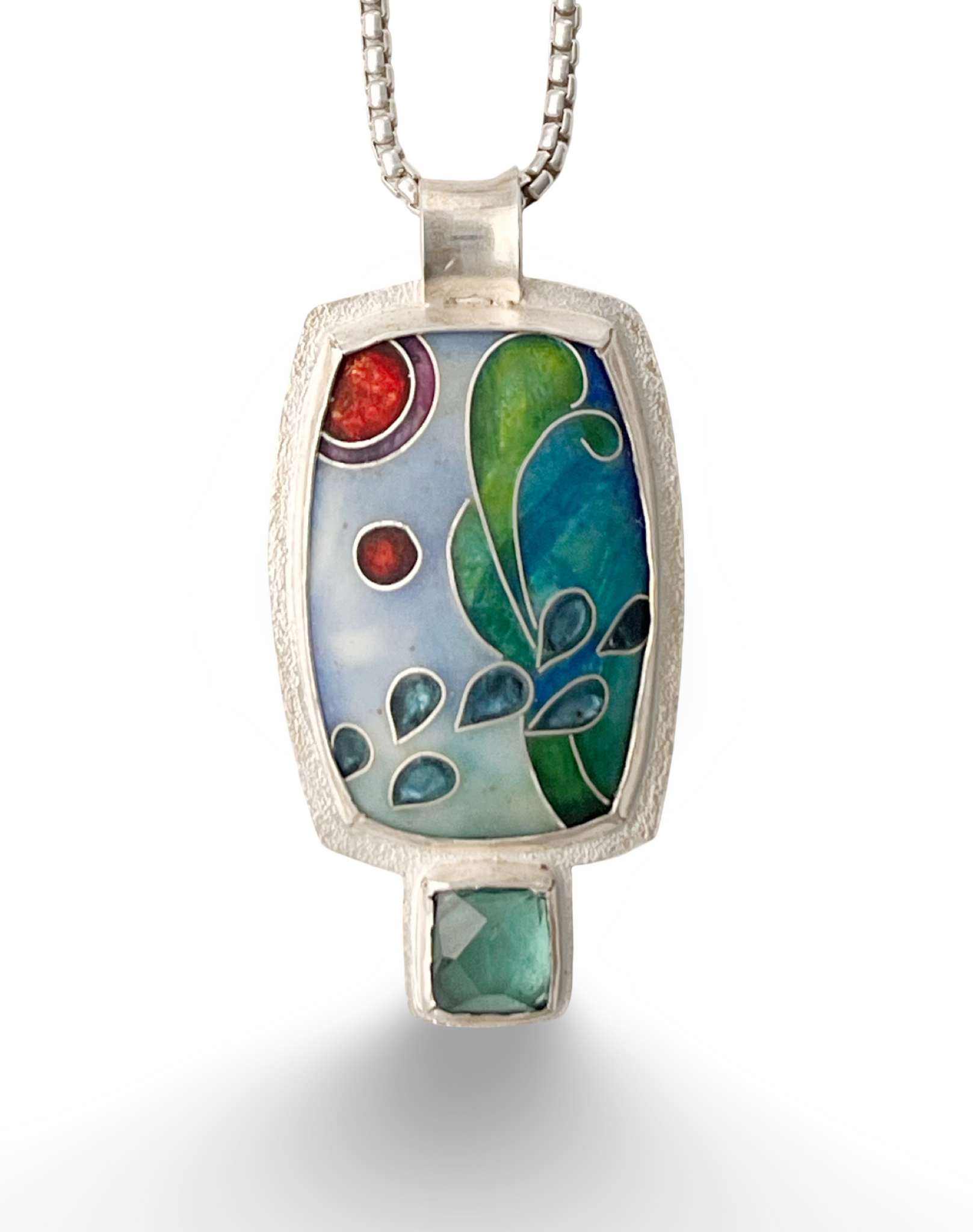 Abstract cloisonné pendant with a blue green rosecut tourmaline set in sterling silver. This pendant is soft blues and greens with red accents. This pendant measures 1.8" by .85" and hands on a 16-18" chain with a hand forged clasp.